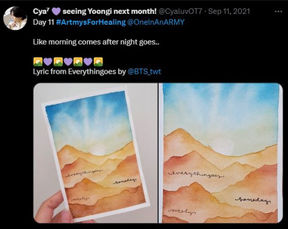 But that's not all. While ARMY were helping Usikimye create a safe physical and emotional environment for women and girls in Kenya, they also worked hard to create a safe emotional environment for people in their own communities. The Bonus Mission for Jungkook and Namjoon's flash campaigns, Artmys for Healing, encouraged ARMY to create art with encouraging messages.